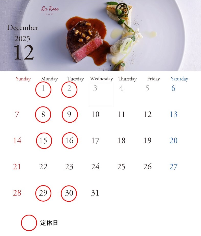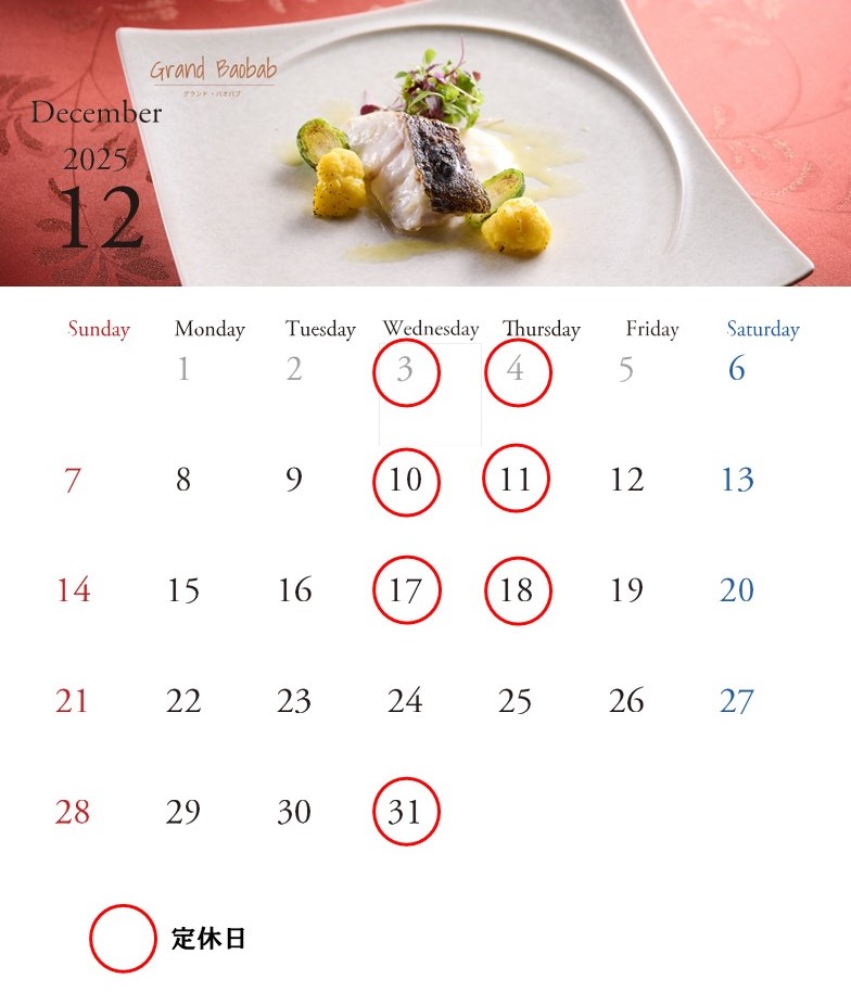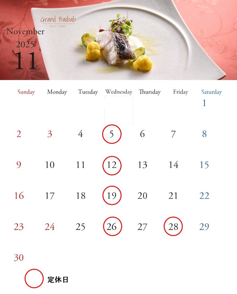 レストラン11月・12月の営業日のご案内でございます。