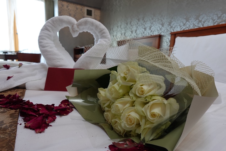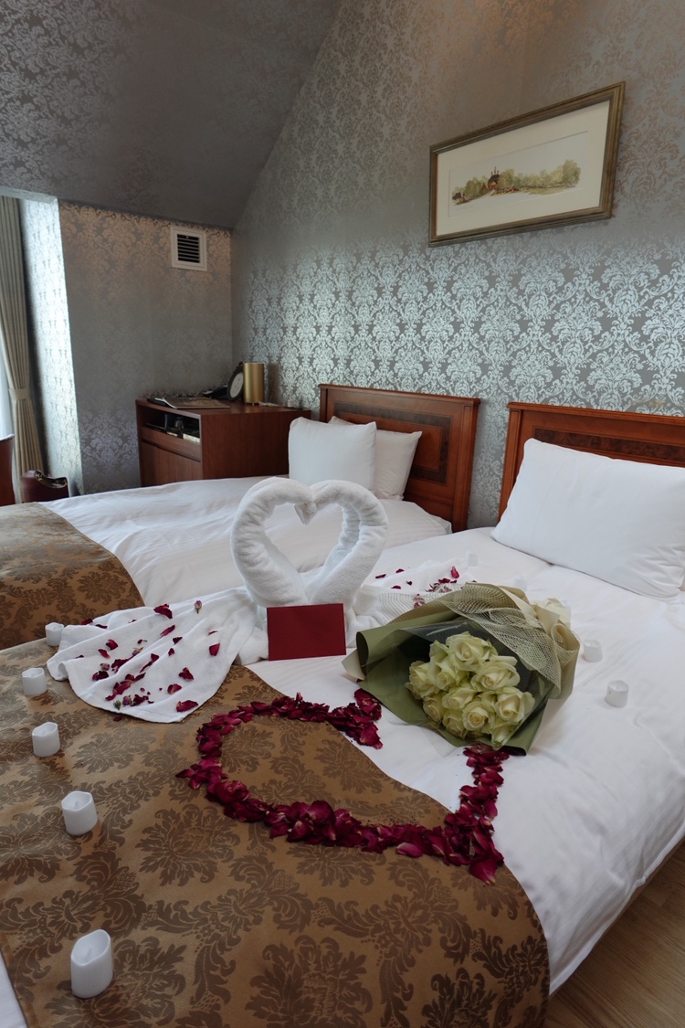 ベッドの上に設えられたのは、二羽の白鳥が寄り添い、ハートを象るタオルアート。その周りには、色鮮やかなバラの花びらと、淡い光を放つキャンドルが並びます。アンティーク調の落ち着いた客室が、この瞬間、お二人だけの特別な神殿へと変わります。